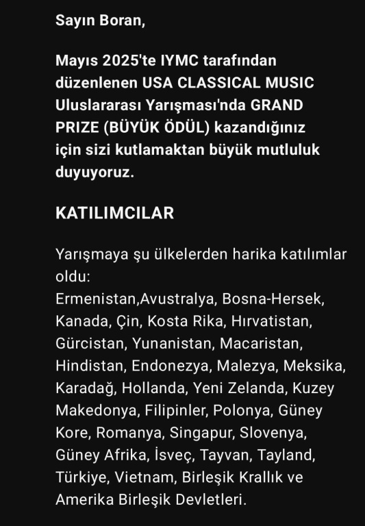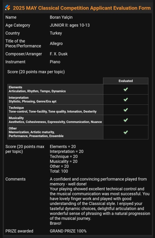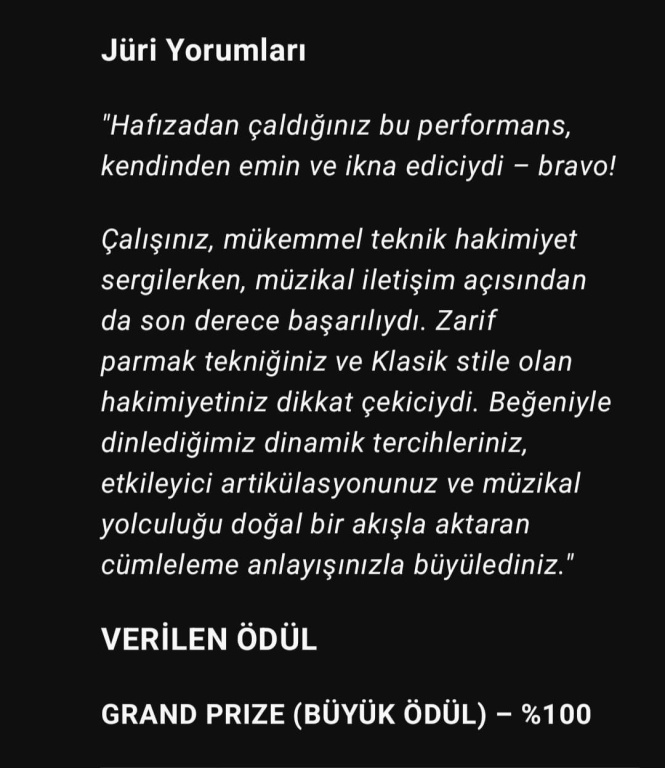 Amerika merkezli İnternational Youth Music Competitions yarışmasında 100 tam puan alarak Grand Prize ödülünü almaya hak kazandı. Tebrik ederiz